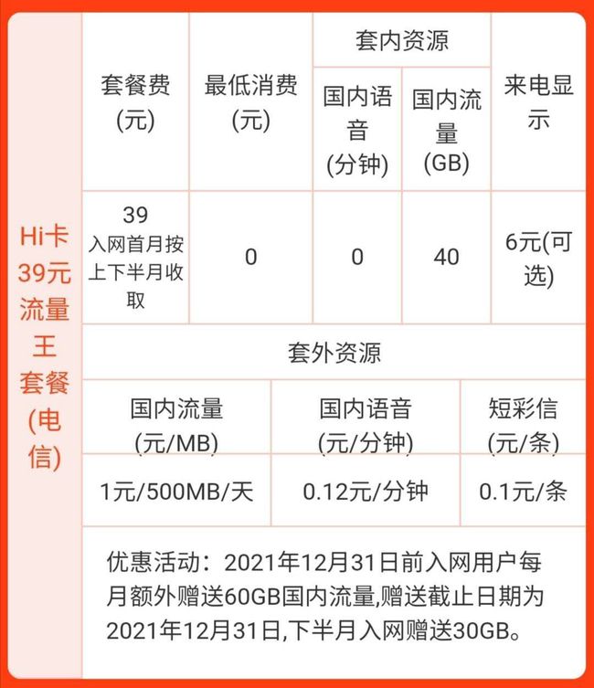 电信网络制式的套餐是39元40g流量,另外加送60g流量到2021年12月31日,总共100g流量,不限速,打电话0.12元,短信0.1元,来电显示要自己开通,6元每月。可以更加自己的需求买自己需要的卡